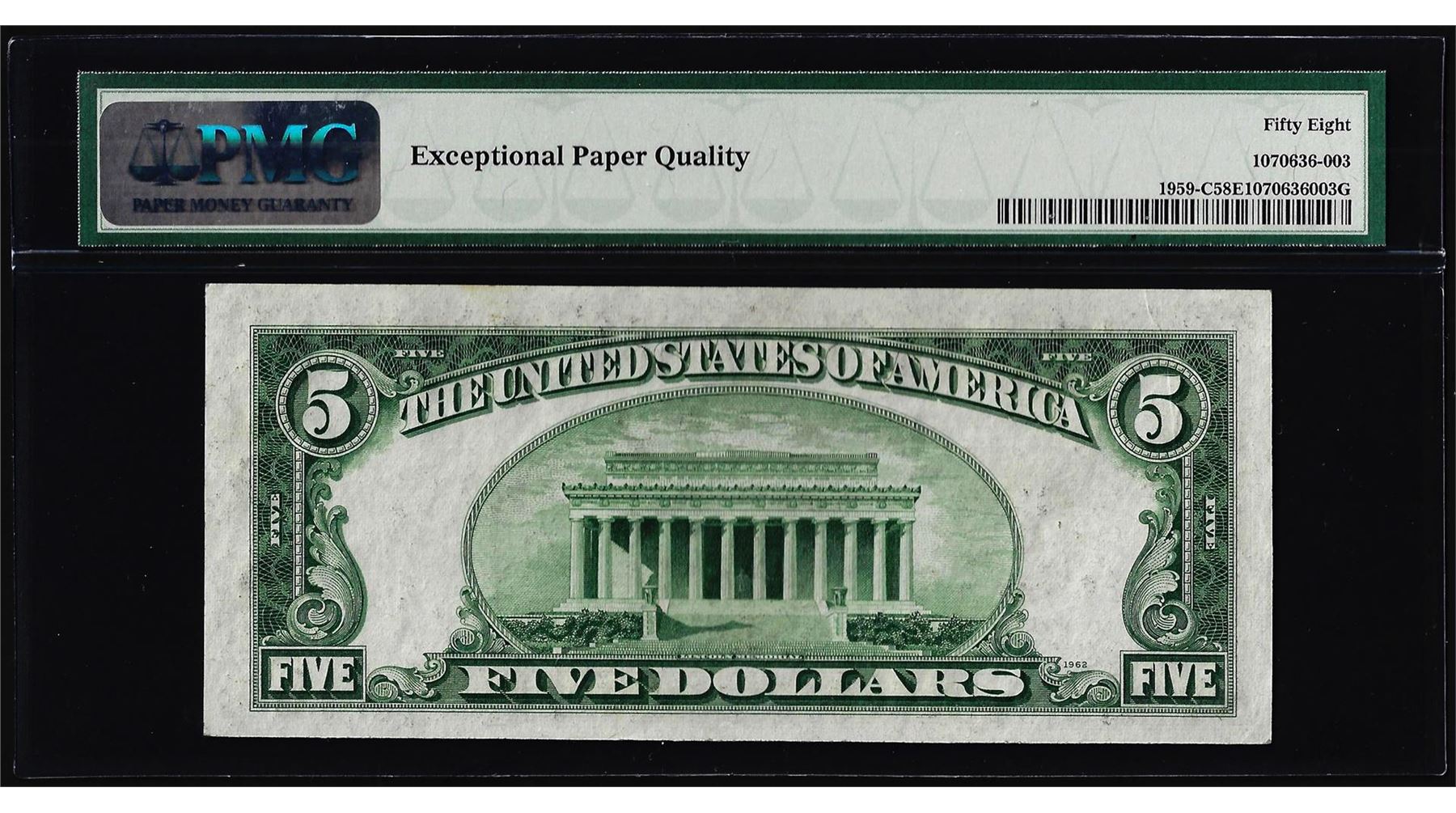 One 1934C $5 Federal Reserve Note Philadelphia Fr.1959-C PMG Choice About Unc. 58EPQ. PMG Certified.