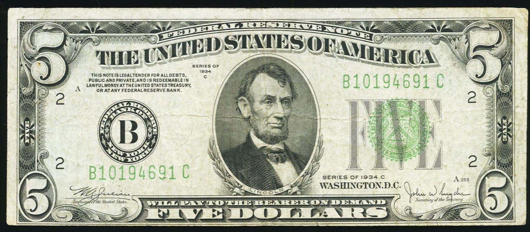 One 1934C $5 New York Federal Reserve Note.