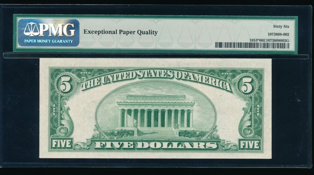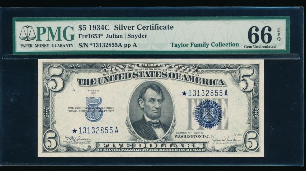 One 1934C $5 STAR Silver Certificate PMG 66EPQ.
