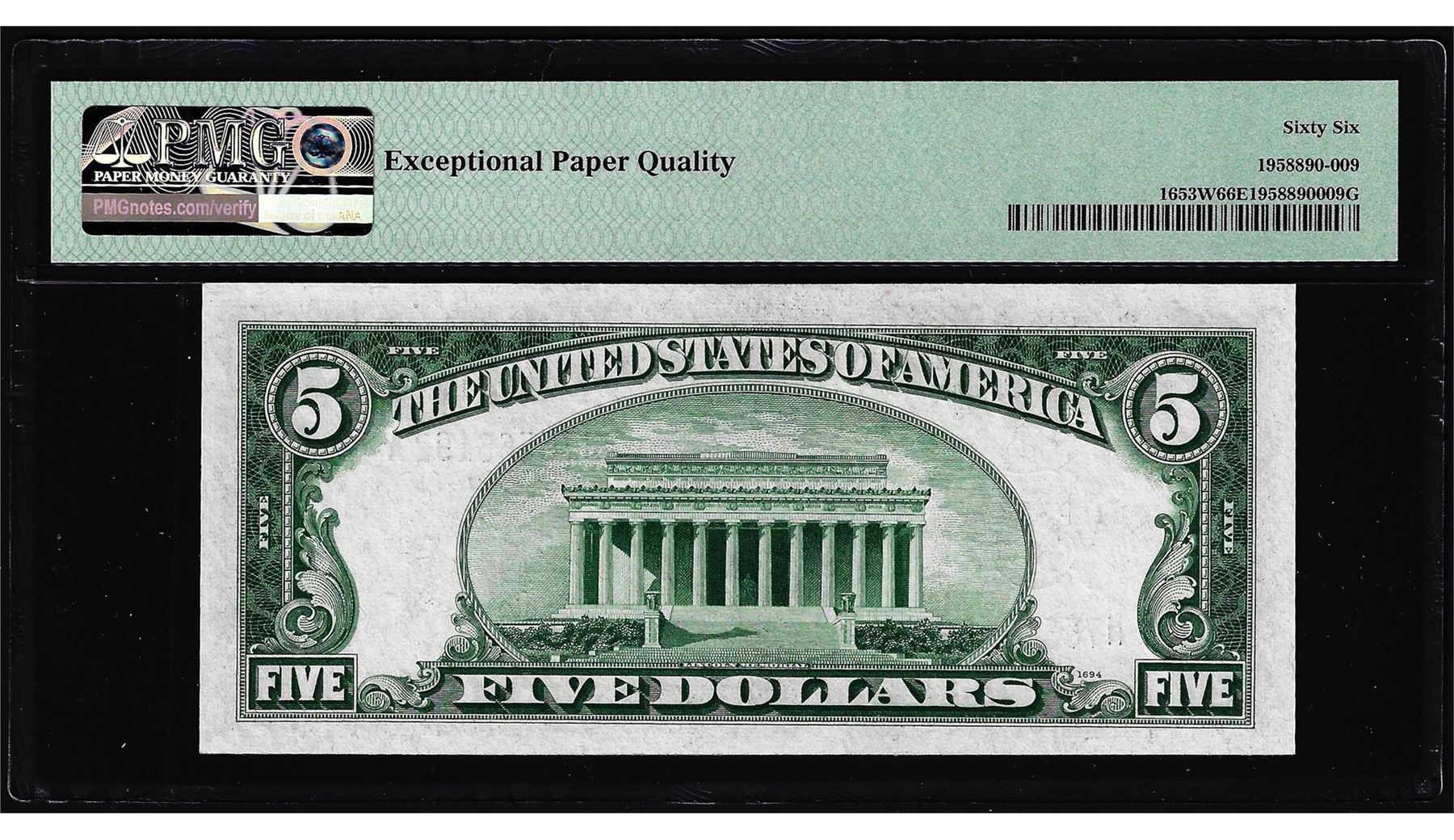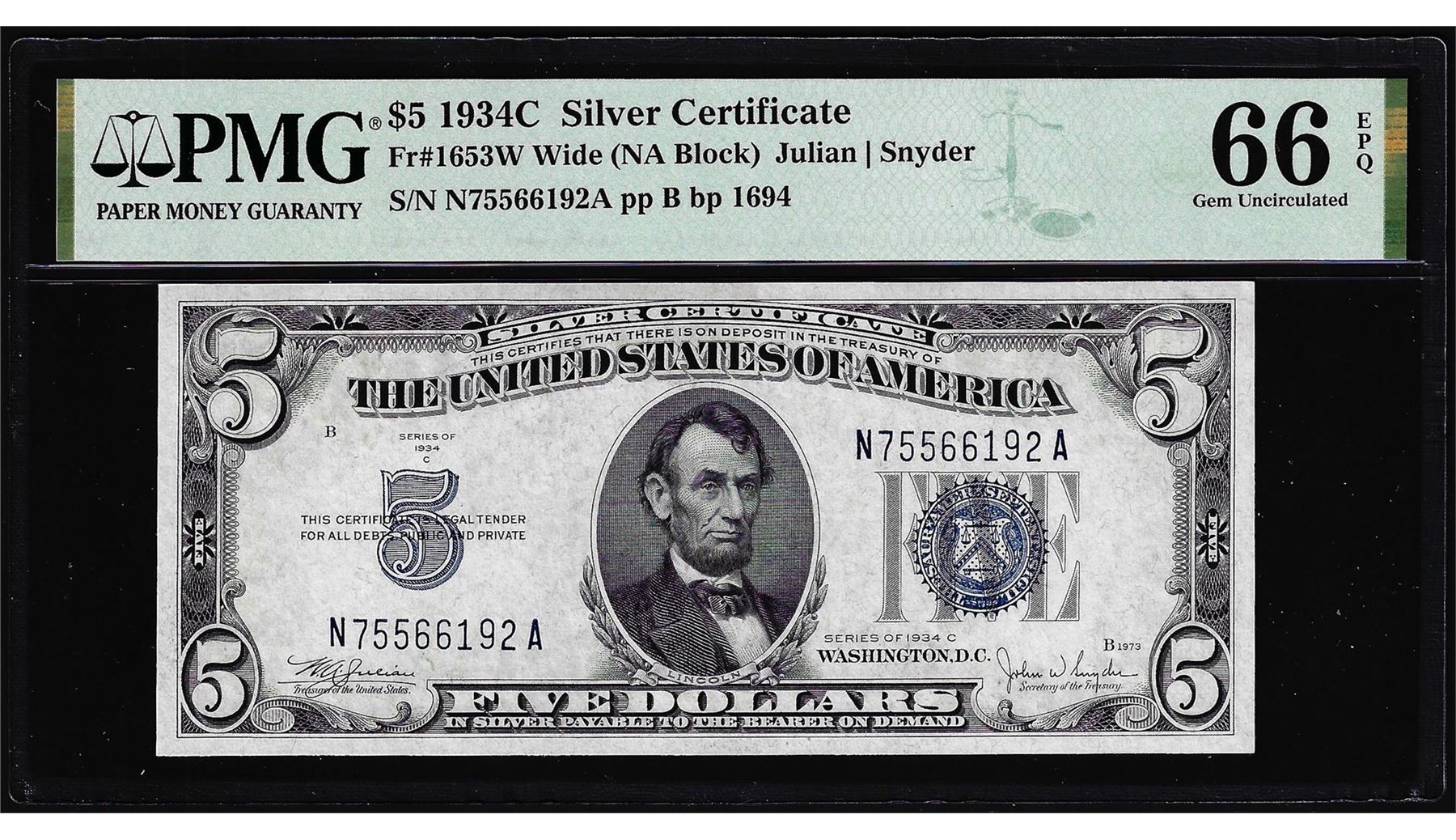 One 1934C $5 Silver Certificate Note Fr.1653W Wide PMG Gem Uncirculated 66EPQ. PMG Certified.