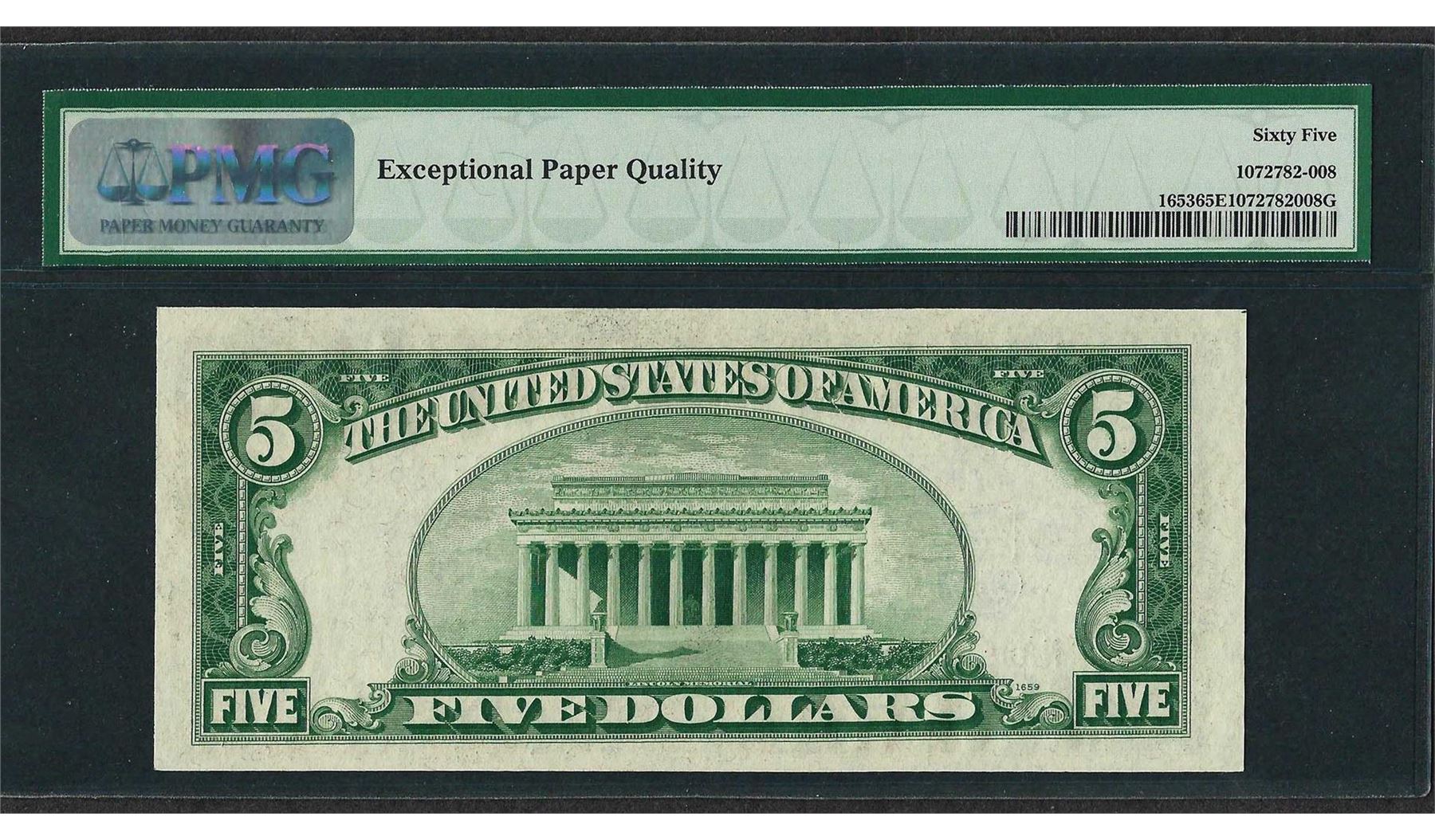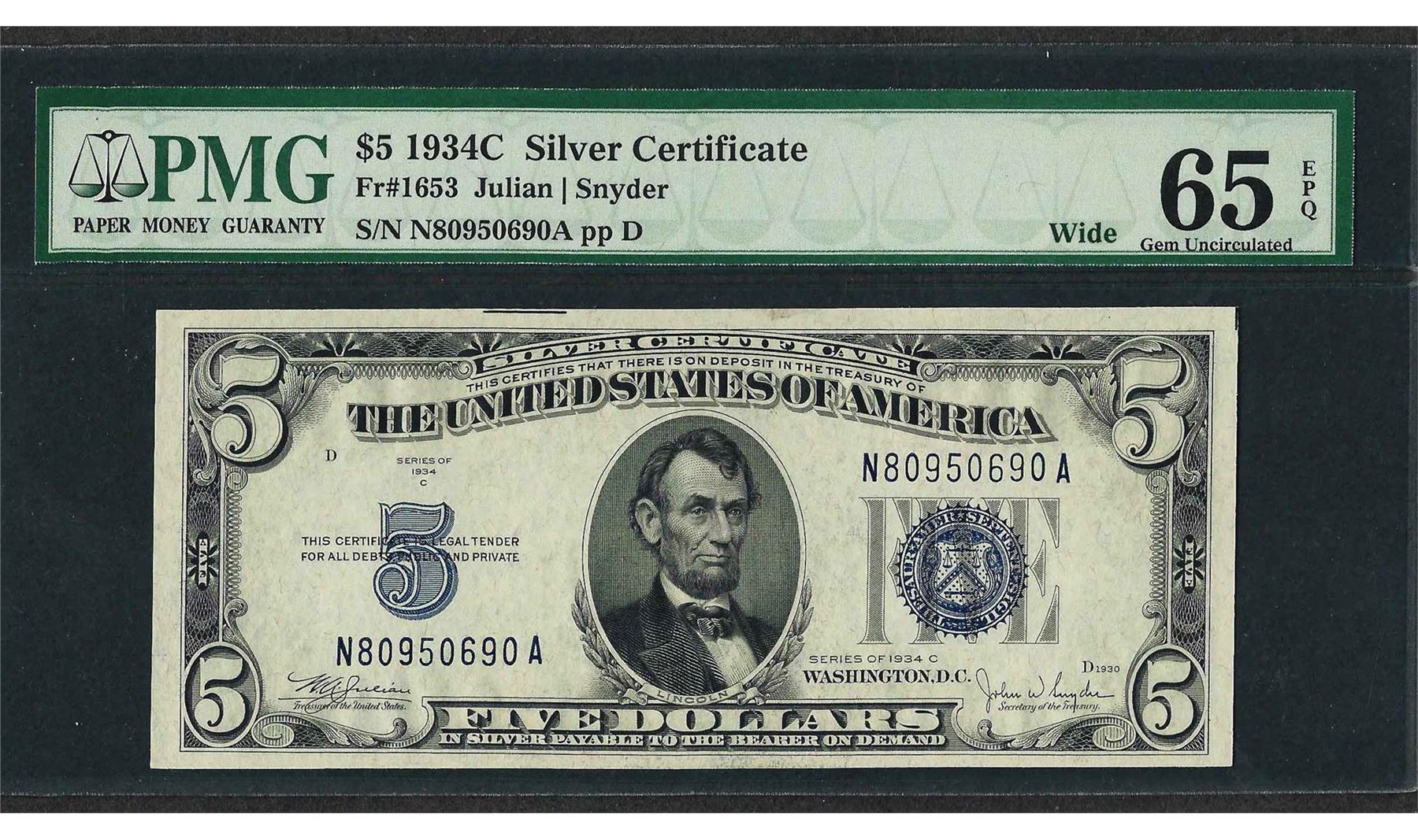 One 1934C $5 Silver Certificate Note Wide Fr.1653 PMG Gem Uncirculated 65EPQ. PMG Certified.