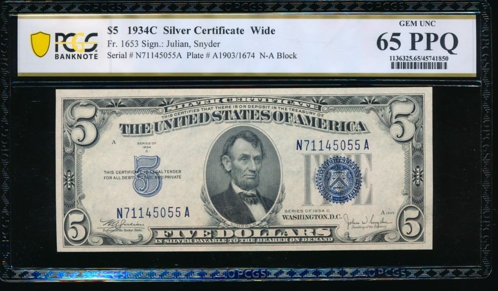 One 1934C $5 Silver Certificate PCGS 65PPQ.