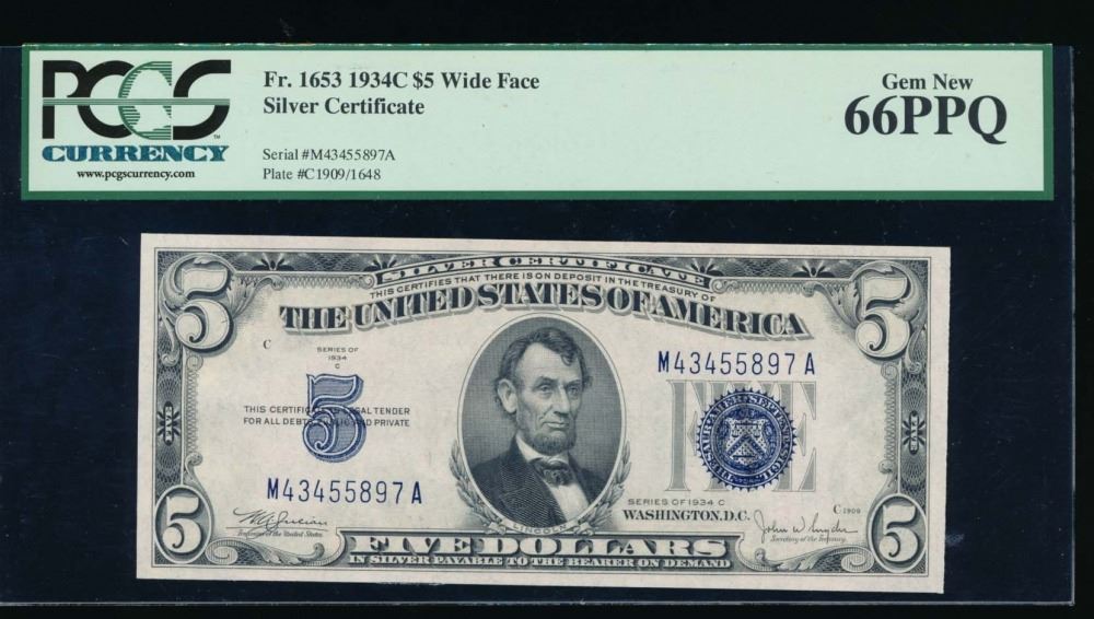 One 1934C $5 Silver Certificate PCGS 66PPQ.