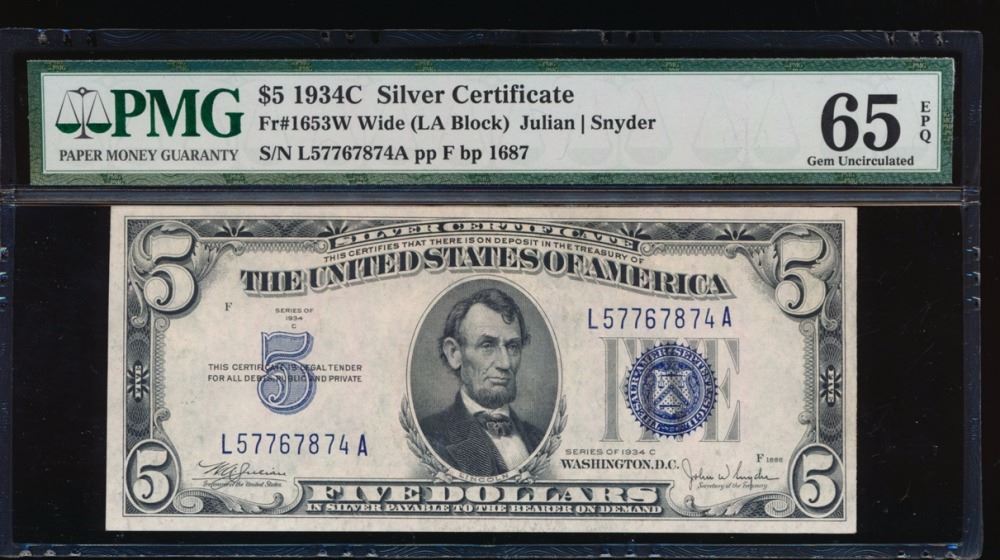 One 1934C $5 Silver Certificate PMG 65EPQ.