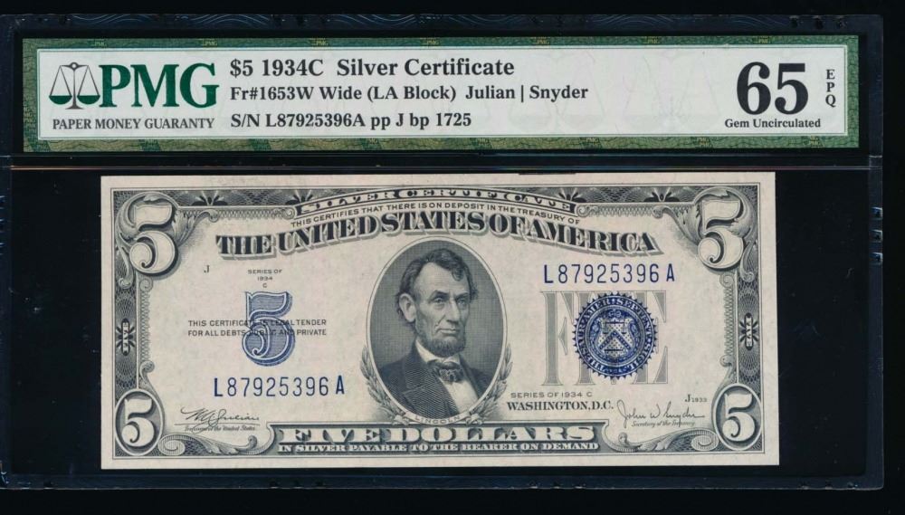 One 1934C $5 Silver Certificate PMG 65EPQ.
