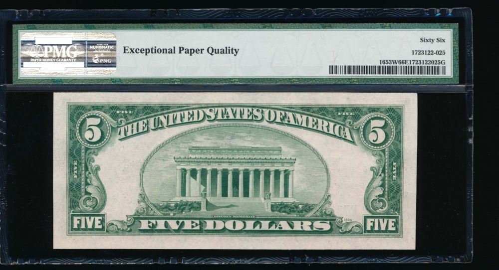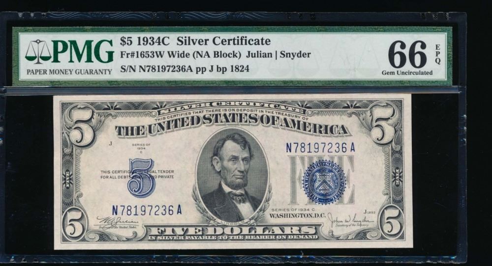 One 1934C $5 Silver Certificate PMG 66EPQ.
