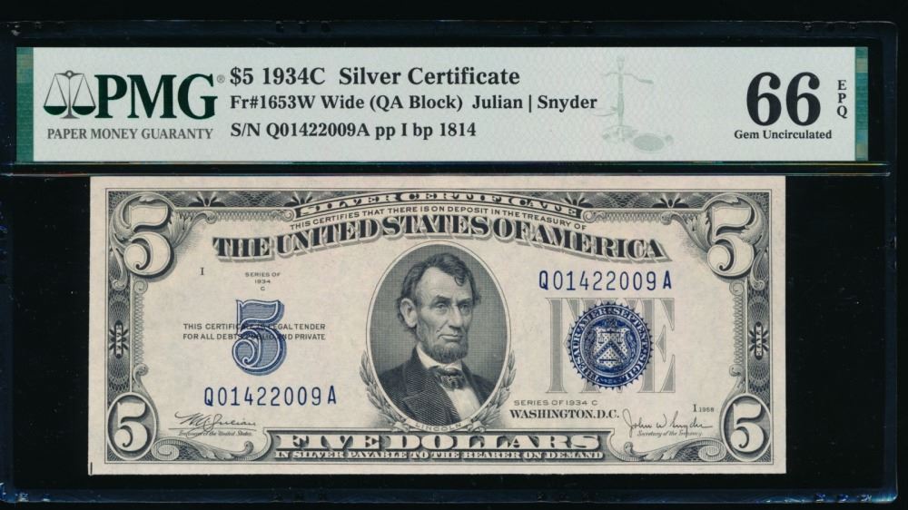 One 1934C $5 Silver Certificate PMG 66EPQ.