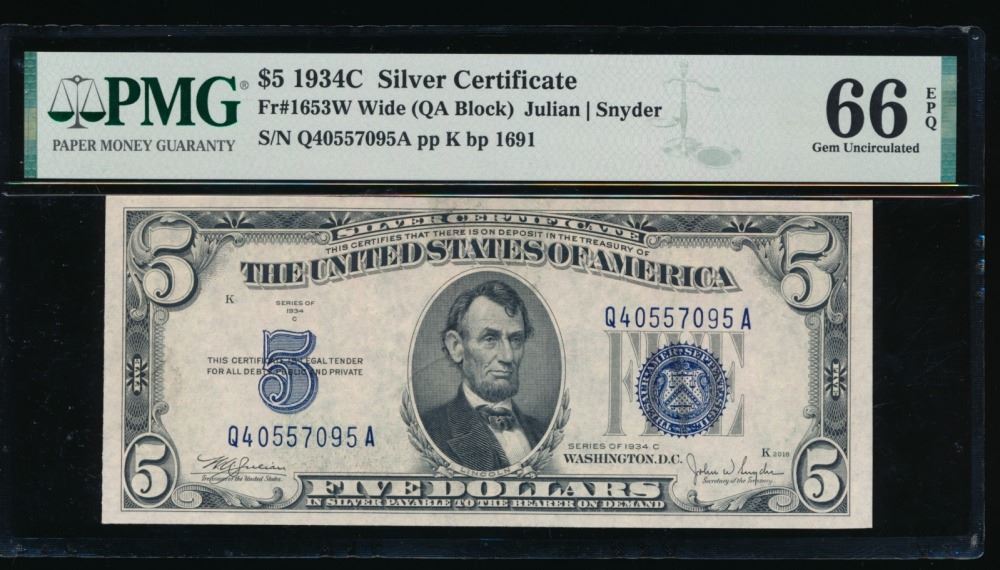 One 1934C $5 Silver Certificate PMG 66EPQ.