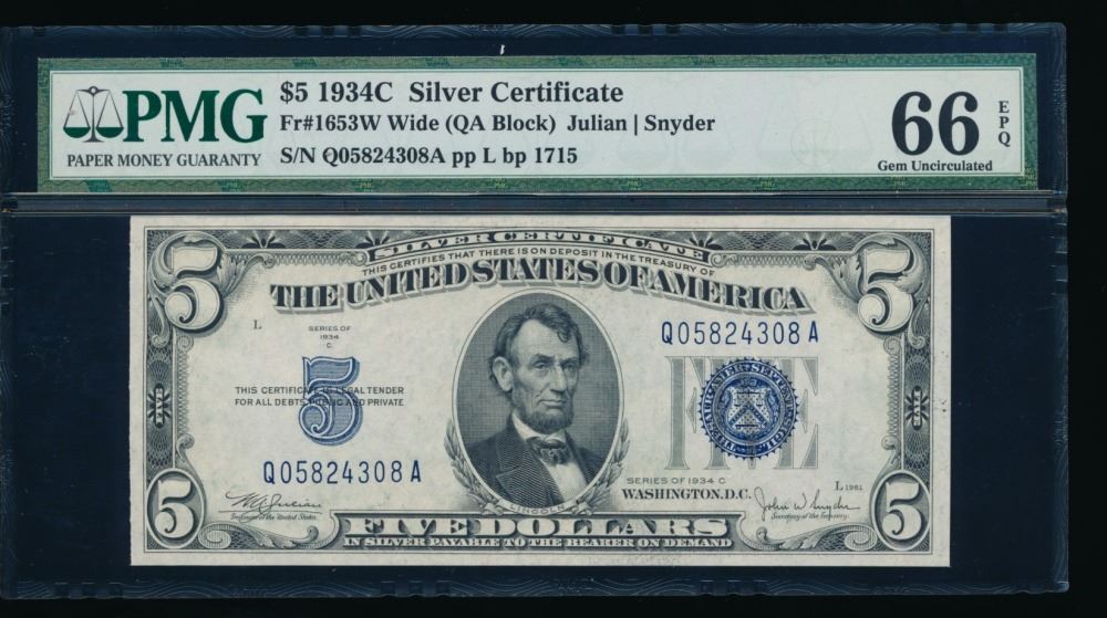 One 1934C $5 Silver Certificate PMG 66EPQ.