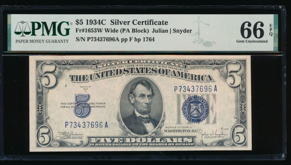 One 1934C $5 Silver Certificate PMG 66EPQ.