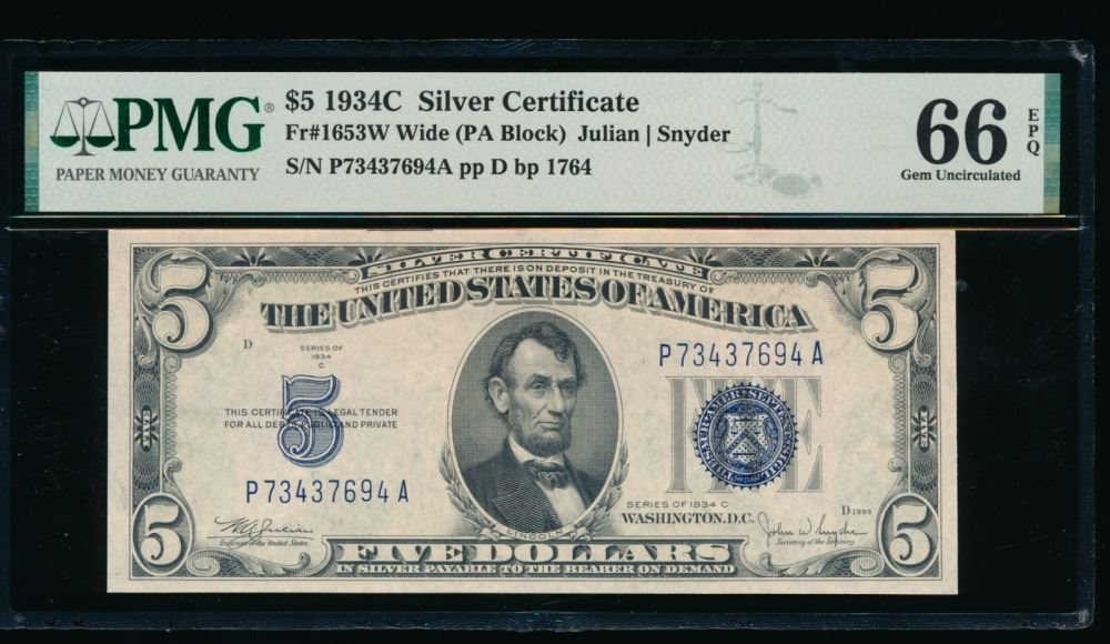 One 1934C $5 Silver Certificate PMG 66EPQ.