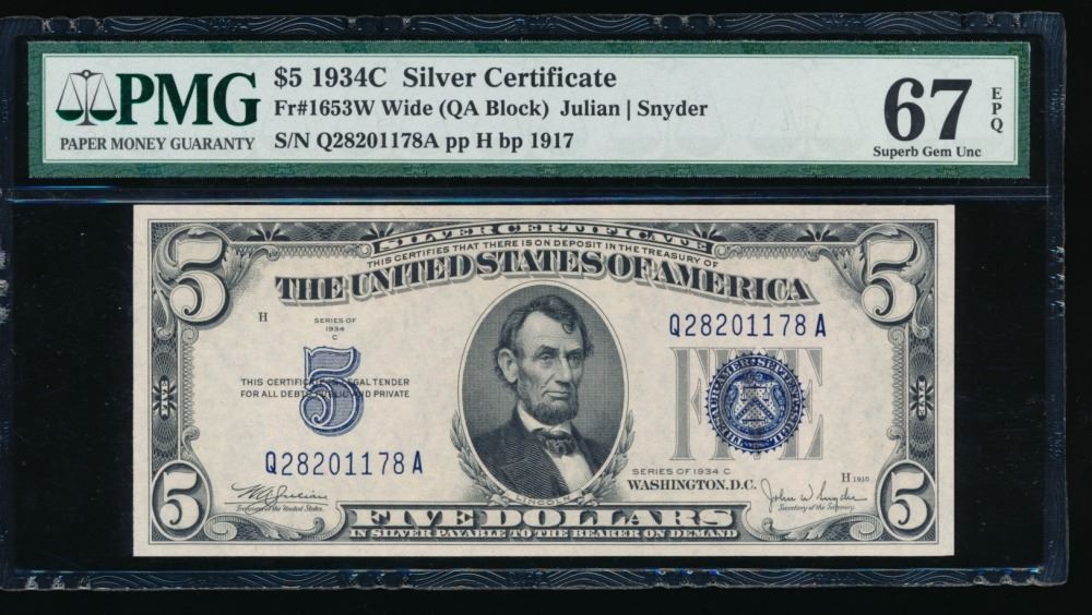 One 1934C $5 Silver Certificate PMG 67EPQ.