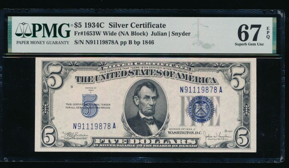 One 1934C $5 Silver Certificate PMG 67EPQ.