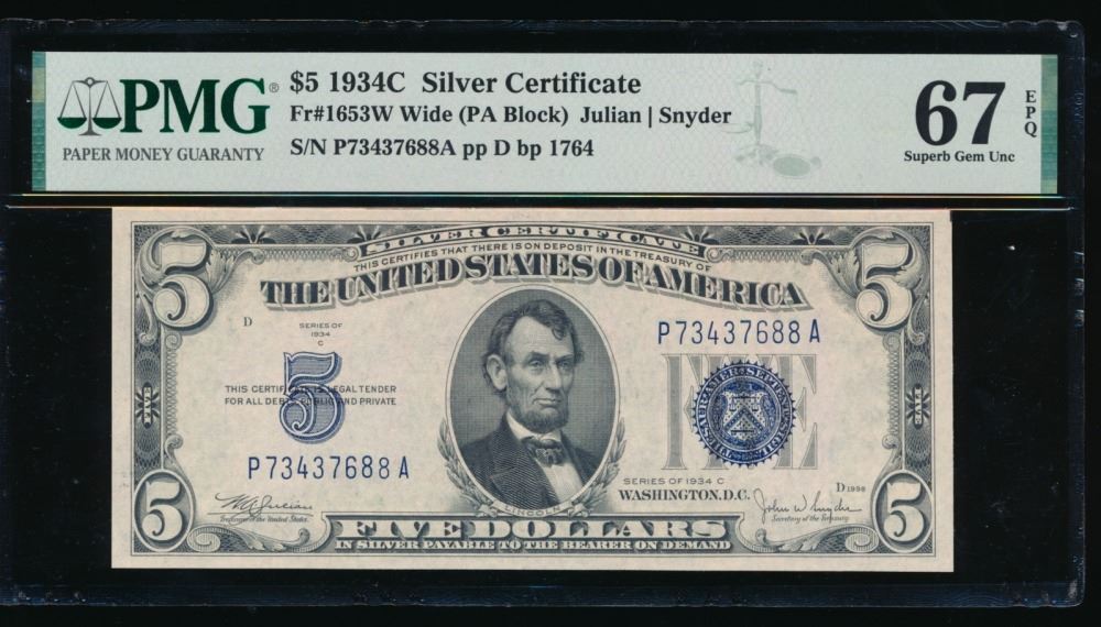 One 1934C $5 Silver Certificate PMG 67EPQ.
