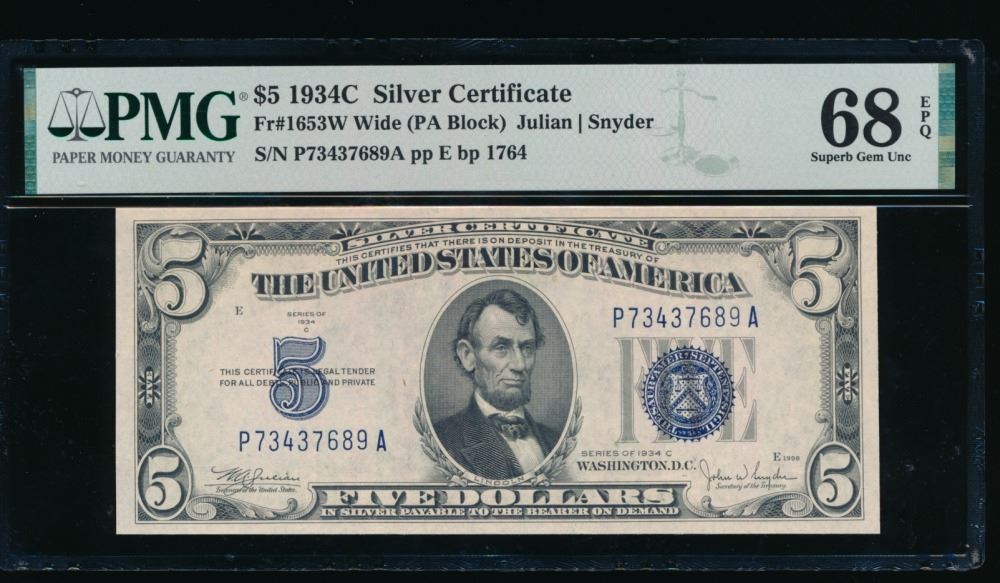 One 1934C $5 Silver Certificate PMG 68EPQ.