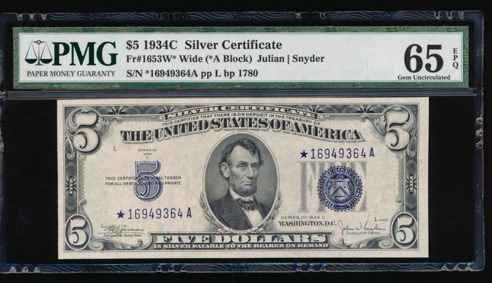 One 1934C $5 Silver Certificate Wide PMG 65EPQ.