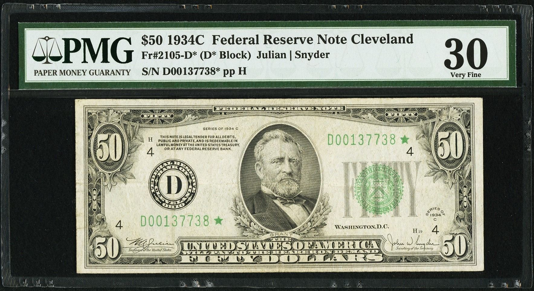 One 1934C $50 Cleveland Federal Reserve STAR Note PMG 30.