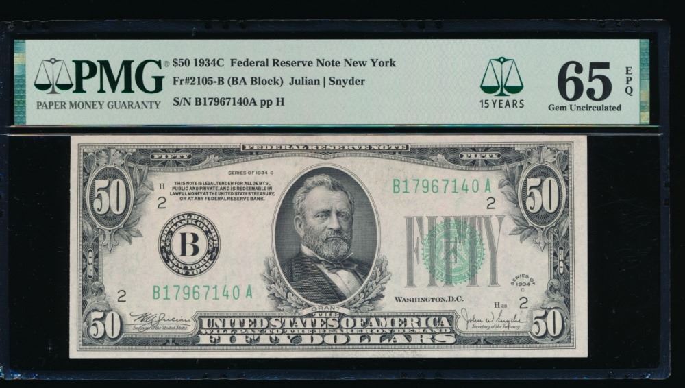 One 1934C $50 New York FRN PMG 65EPQ.