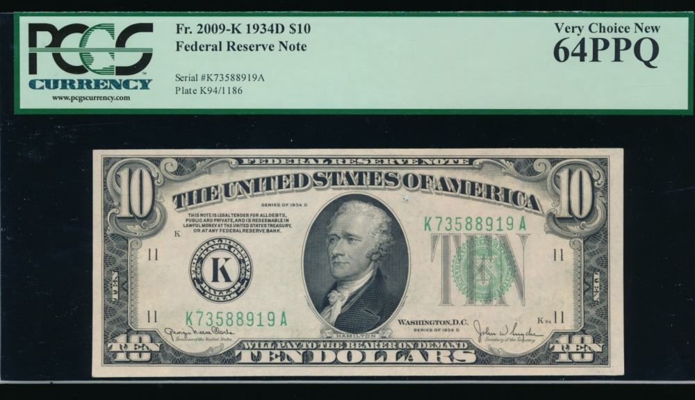 One 1934D $10 Dallas FRN PCGS 64PPQ.