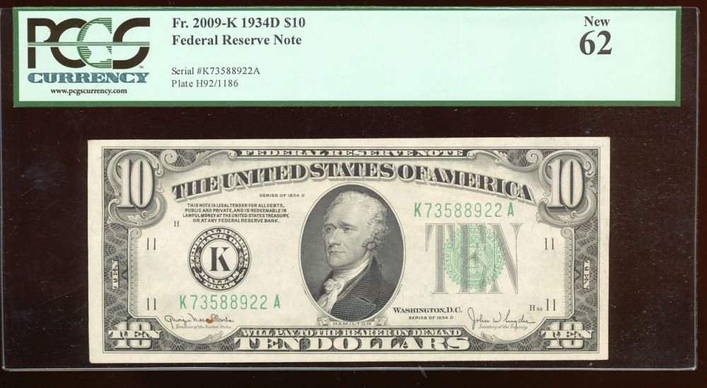 One 1934D $10 Dallas Federal Reserve Note PCGS 62.