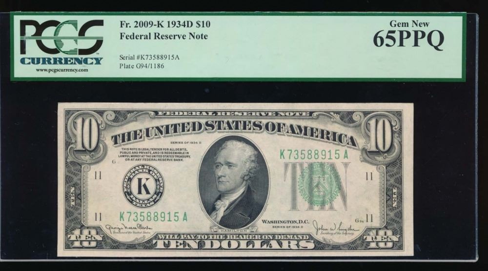 One 1934D $10 Dallas Federal Reserve Note PCGS 65PPQ.