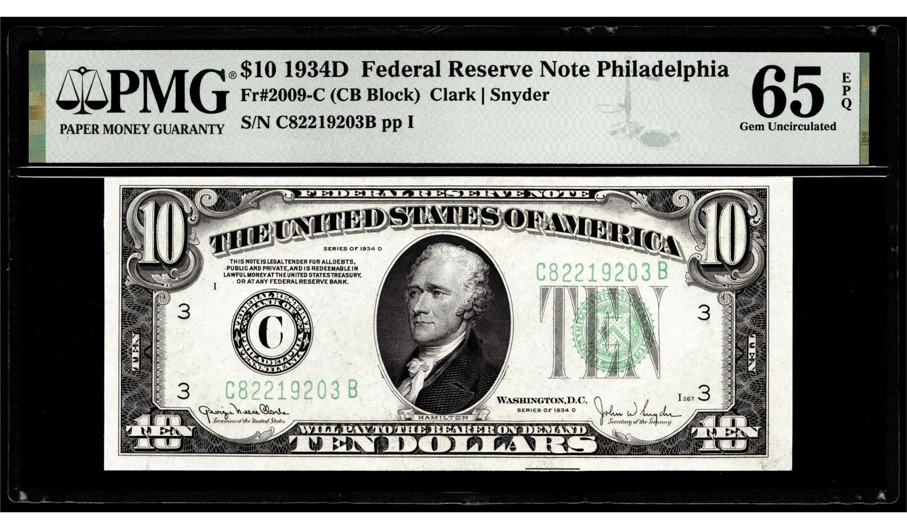 One 1934D $10 Federal Reserve Note Philadelphia Fr.2009-C PMG Gem Uncirculated 65EPQ. PMG Certified.