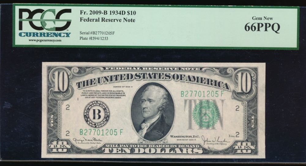 One 1934D $10 New York Federal Reserve Note PCGS 66PPQ.