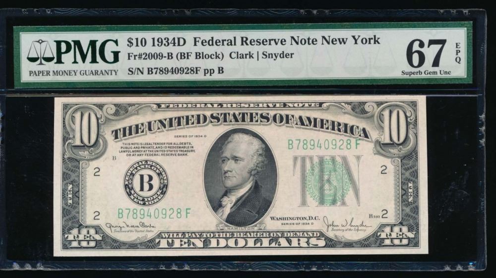 One 1934D $10 New York Federal Reserve Note PMG 67EPQ.