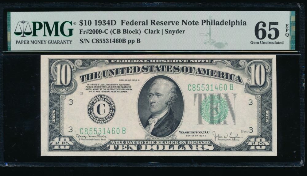 One 1934D $10 Philadelphia FRN PMG 65EPQ.
