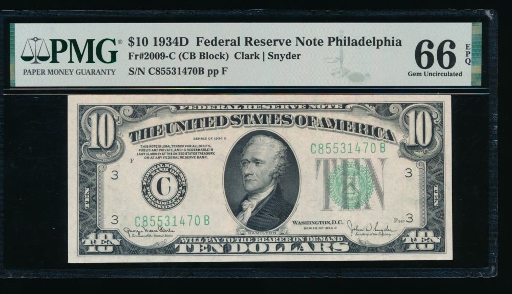 One 1934D $10 Philadelphia FRN PMG 66EPQ.