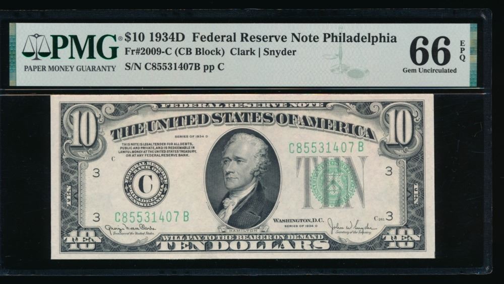 One 1934D $10 Philadelphia FRN PMG 66EPQ.