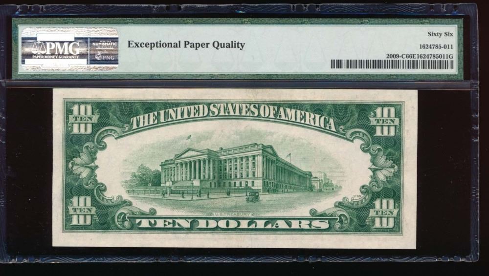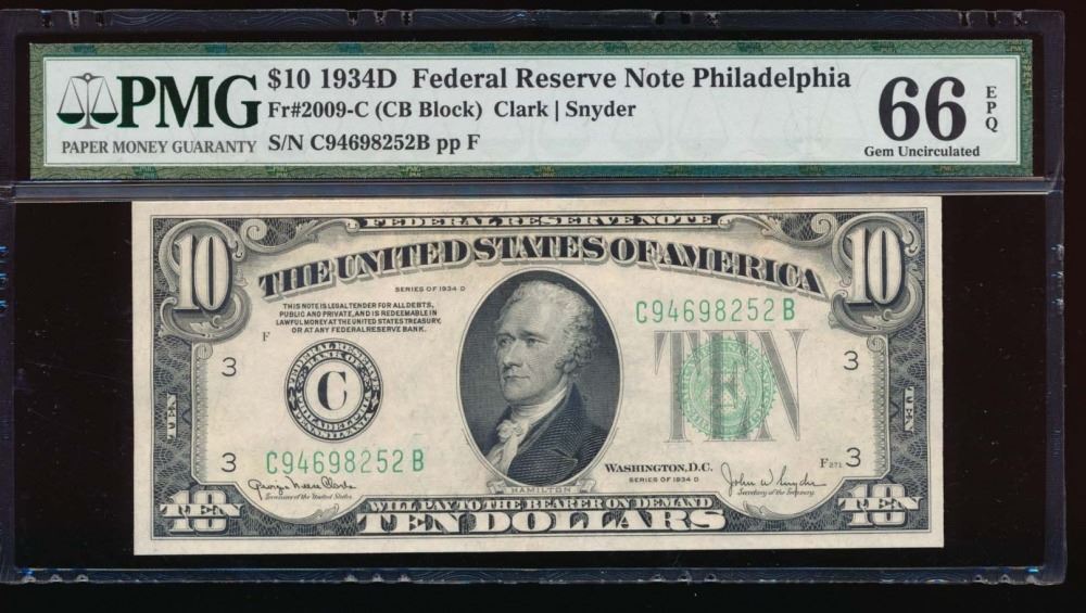 One 1934D $10 Philadelphia Federal Reserve Note PMG 66EPQ.