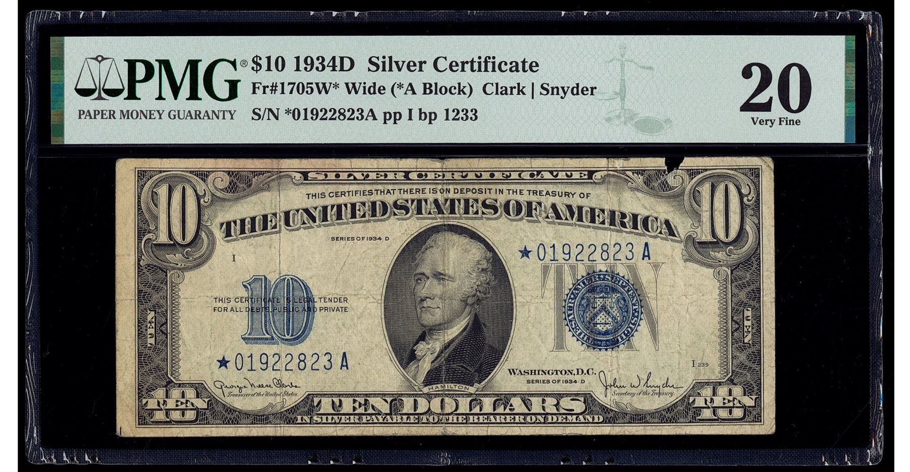 One 1934D $10 STAR Silver Cert PMG 20.