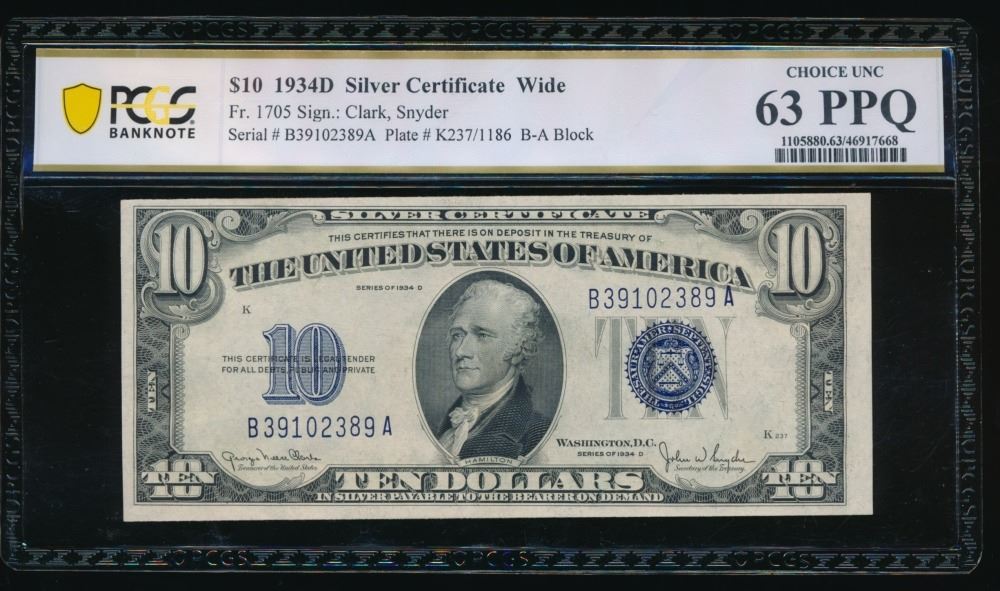 One 1934D $10 Silver Certificate PCGS 63PPQ.