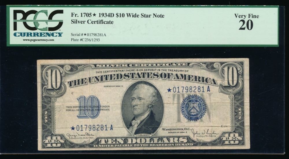 One 1934D $10 Silver Certificate Star Note PCGS 20.