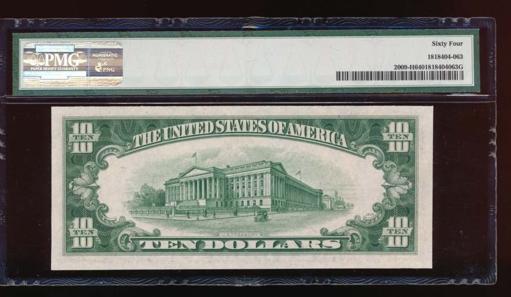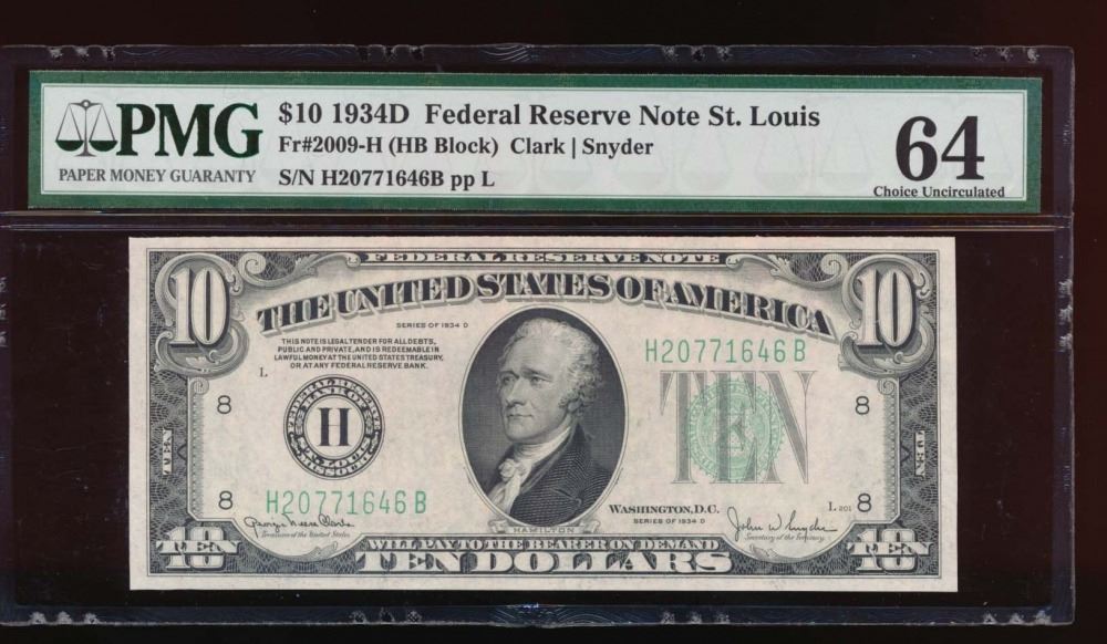 One 1934D $10 St Louis Federal Reserve Note PMG 64.