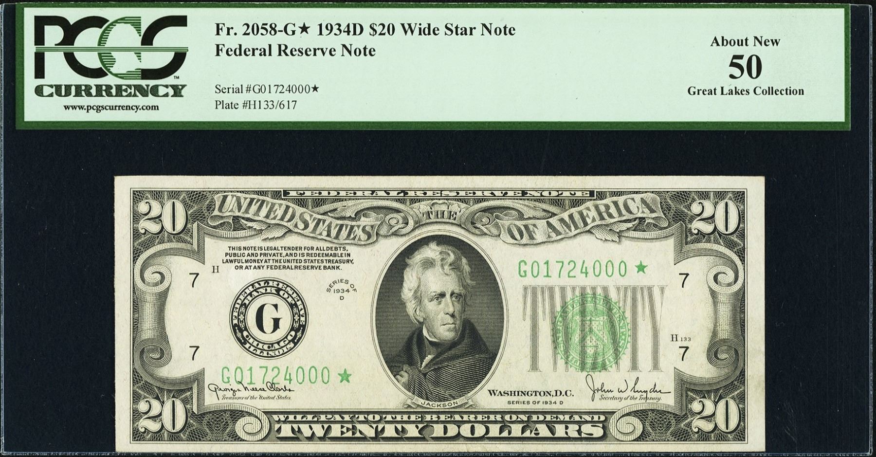 One 1934D $20 Chicago Federal Reserve STAR Note PCGS 50.