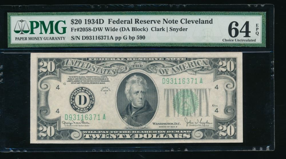 One 1934D $20 Cleveland FRN PMG 64EPQ.