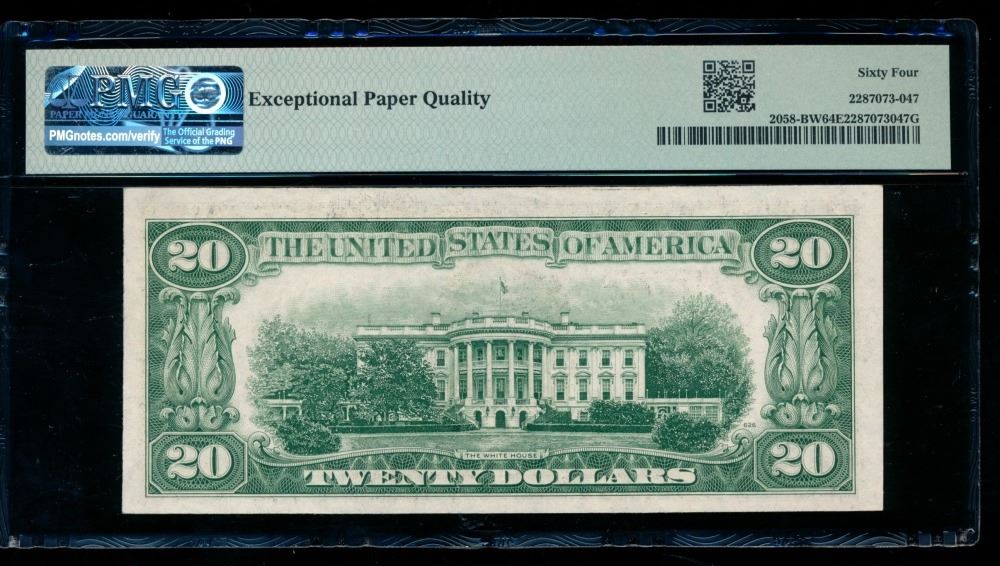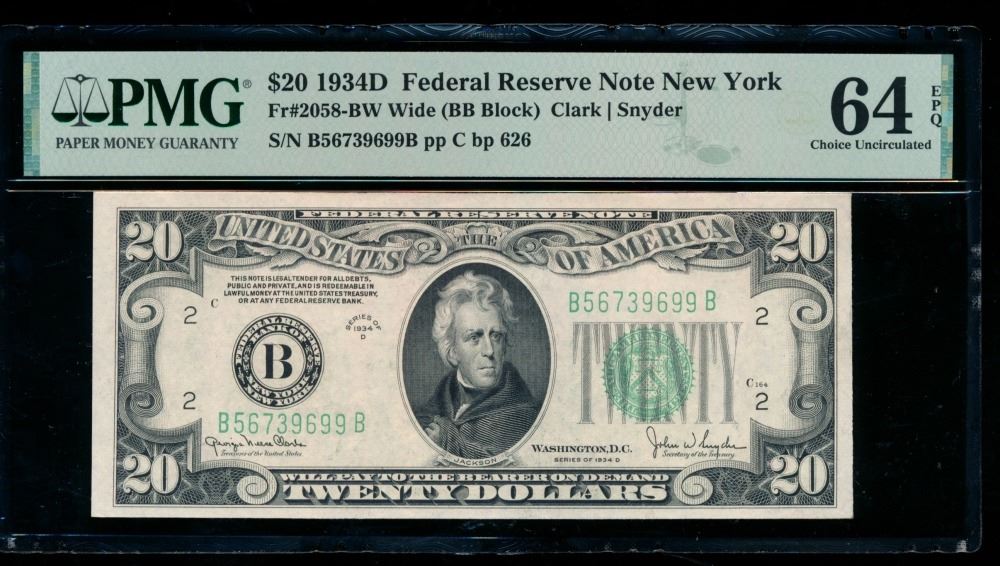 One 1934D $20 New York FRN PMG 64EPQ.