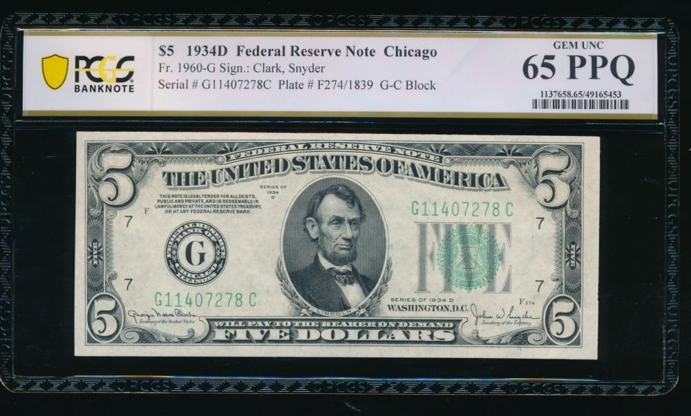 One 1934D $5 Chicago FRN PCGS 65PPQ.