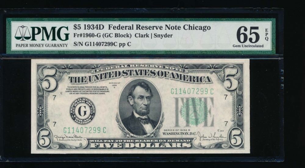 One 1934D $5 Chicago Federal Reserve Note PMG 65EPQ.