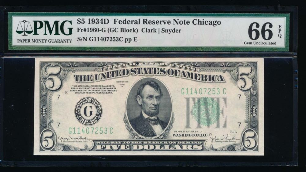 One 1934D $5 Chicago Federal Reserve Note PMG 66EPQ.