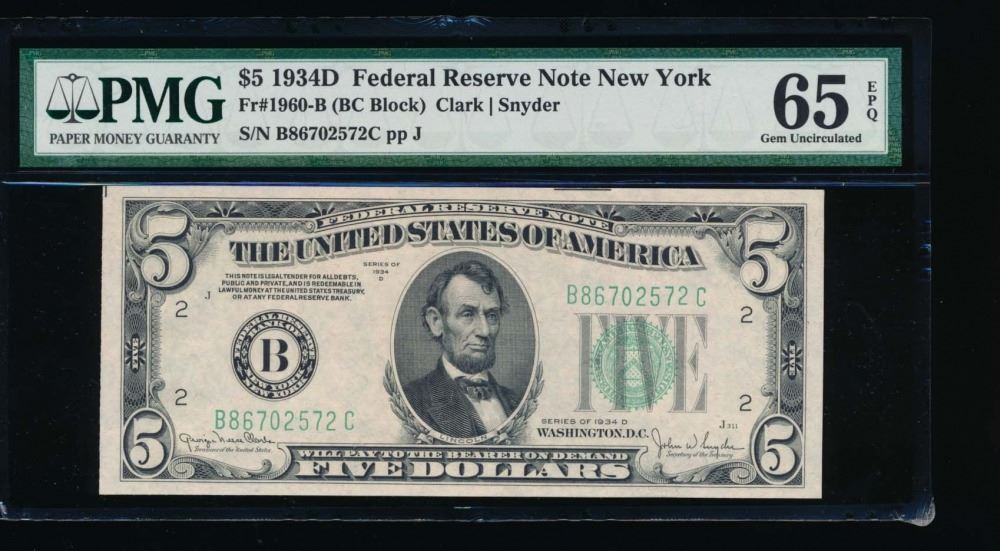 One 1934D $5 New York Federal Reserve Note PMG 65EPQ.
