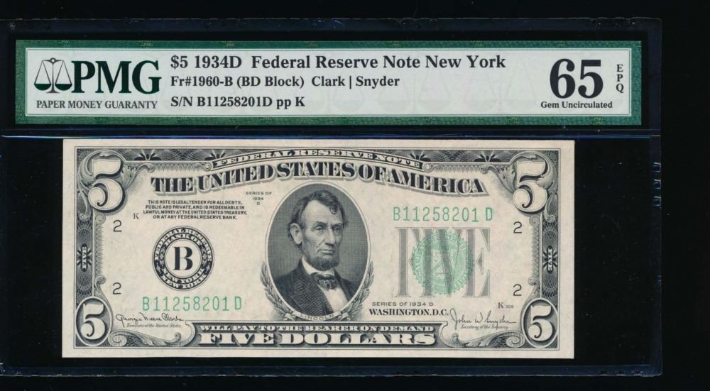 One 1934D $5 New York Federal Reserve Note PMG 65EPQ.