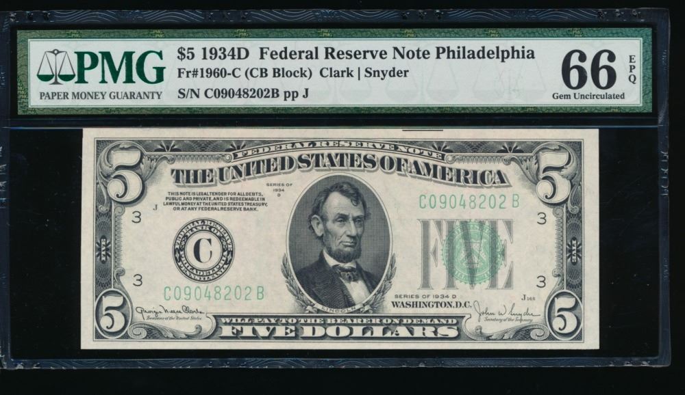 One 1934D $5 Philadelphia FRN PMG 66EPQ.