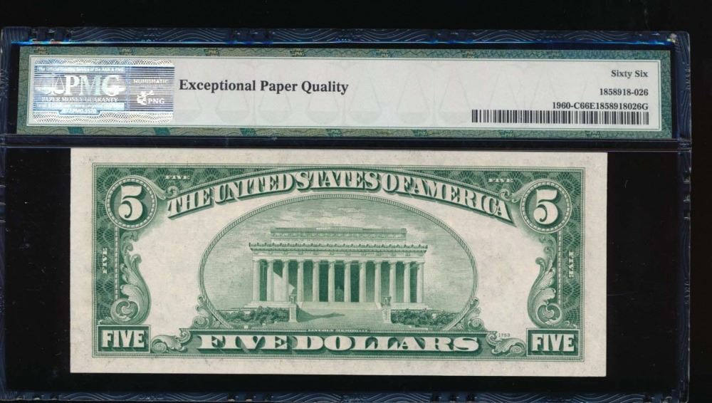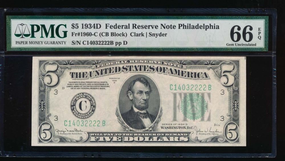One 1934D $5 Philadelphia Federal Reserve Note PMG 66EPQ.