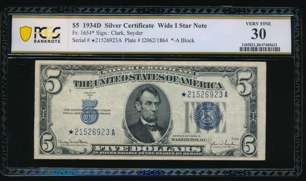 One 1934D $5 STAR Silver Certificate PCGS 30.