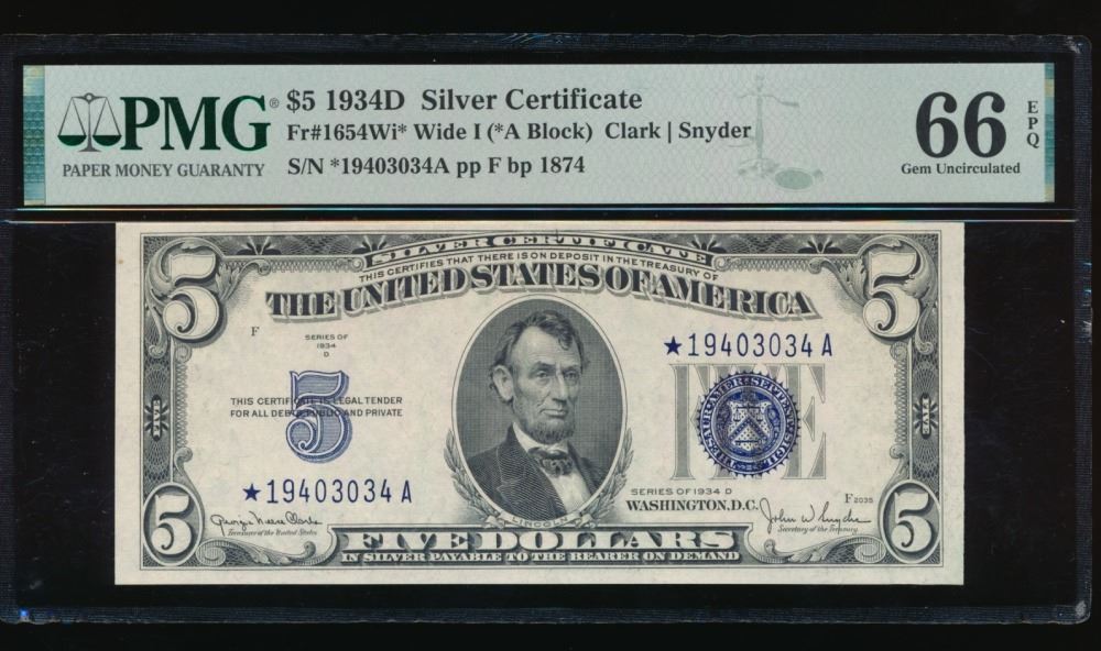 One 1934D $5 STAR Silver Certificate PMG 66EPQ.