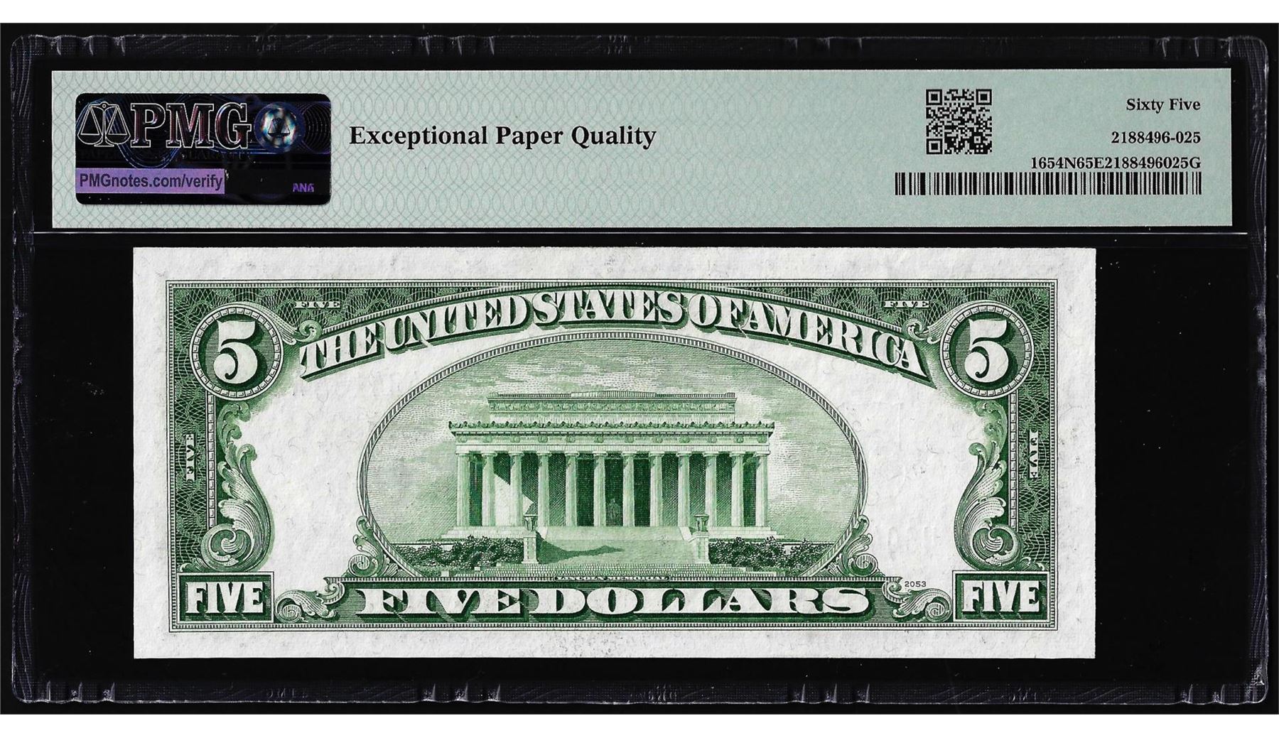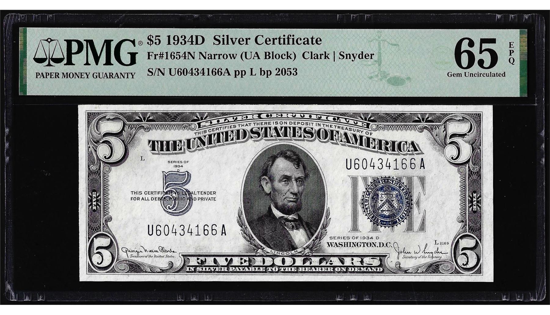 One 1934D $5 Silver Certificate Note Fr.1654N Narrow PMG Gem Uncirculated 65EPQ. PMG Certified.