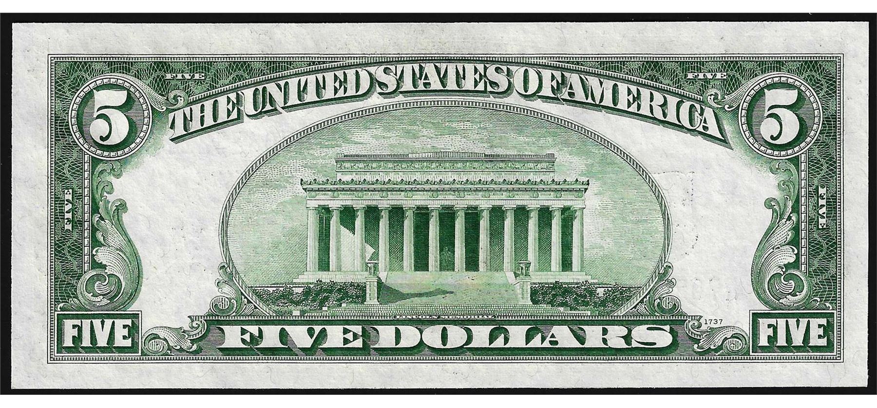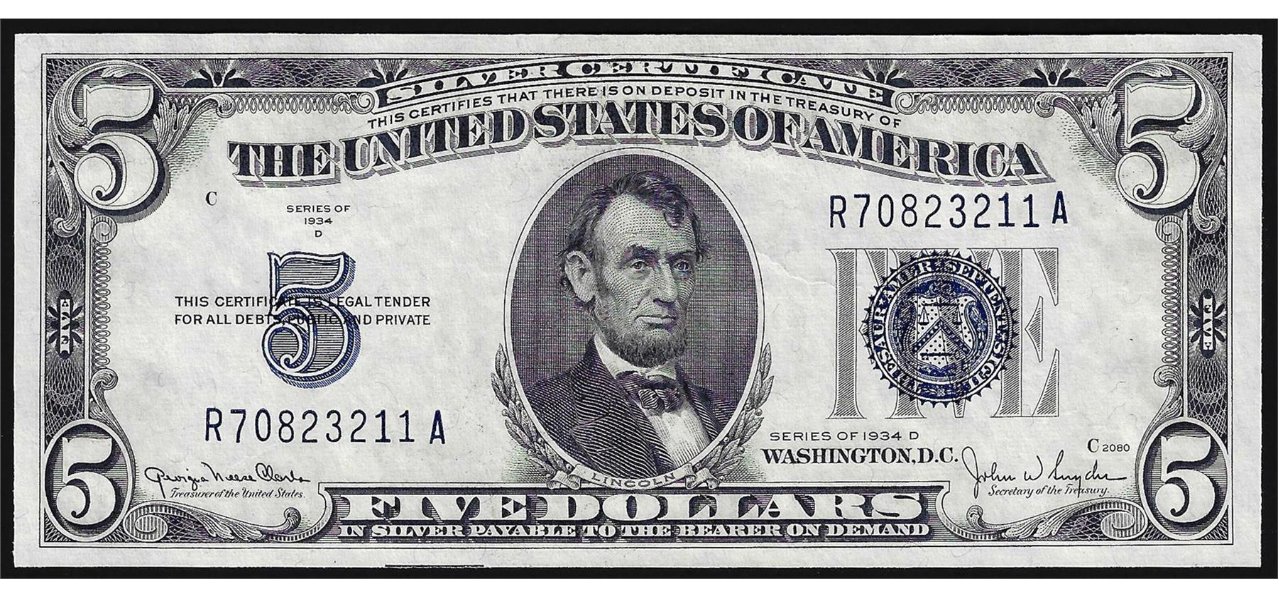 One 1934D $5 Silver Certificate Note Wide I Uncirculated.